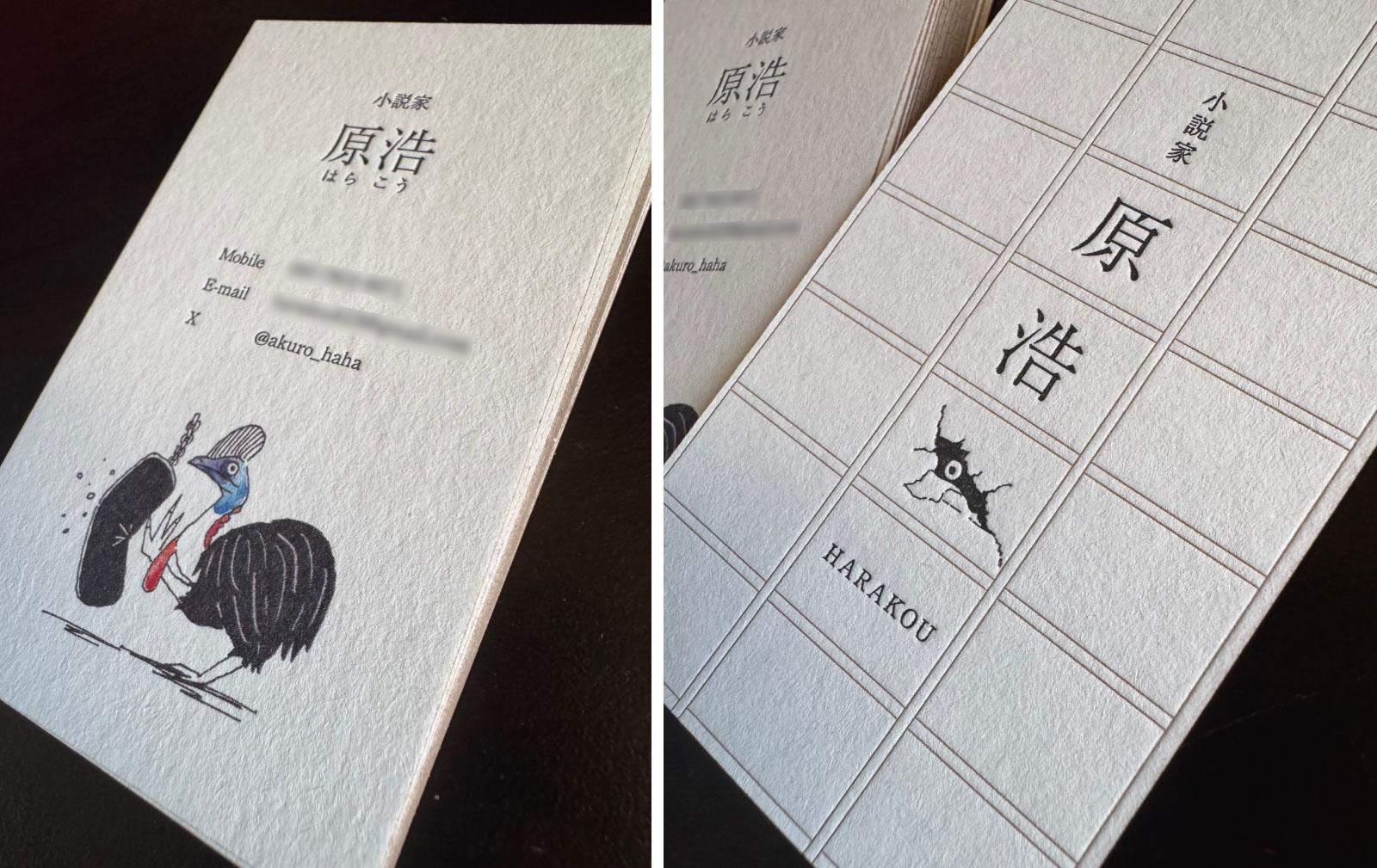 破けた障子からヒクイドリがこちらを覗いているホラー要素も入れました。活版印刷の凹凸で目玉がぎょろっとするところがポイントです。