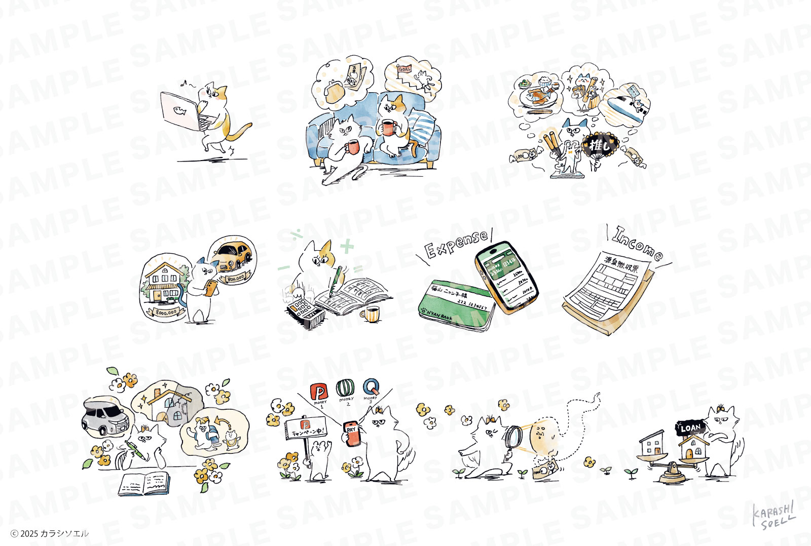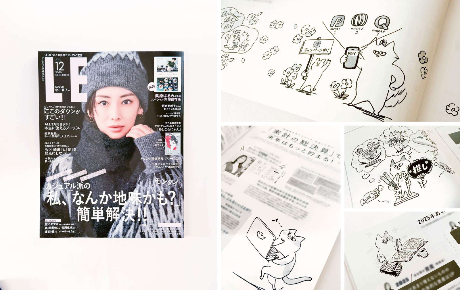 ライフスタイルマガジン「LEE」2025年12月号で挿絵を描きました。 P206-211「家系の総決算で来年はもっと貯まる!」でお金に関する猫たちのイラストが掲載されています。
