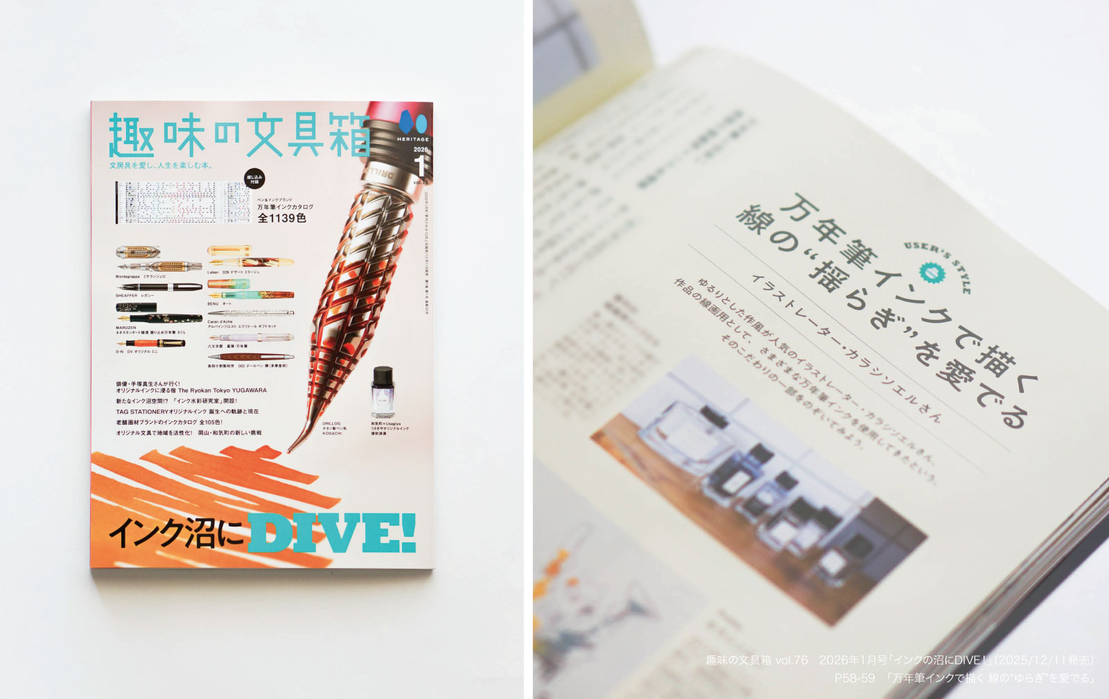 ヘリテージ社の「趣味の文具箱」vol.76 (2026年1月号)の特集「インクの沼にDIVE!」で、万年筆インクで描くイラストについて取材をしていただきその記事が掲載されました。